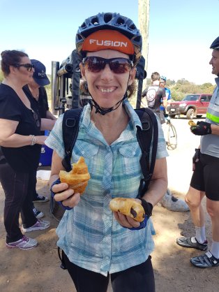 Back on the bitumen on Mokine Rd, there was a super fun downhill section, which was stopped short due to a right hand turn – taking us back uphill. By this time, the smokey fog that had obscured the sun in the early morning had cleared, and the heat was starting to bite. It was not yet 10am. Our reward for the tough climb was reaching the York Olive Oil Company, where a croissant and coffee brunch was supplied as part of the ride. I also enjoyed the chance to catch up with some of my buddies who were volunteering, or doing the 50 mile ride.
