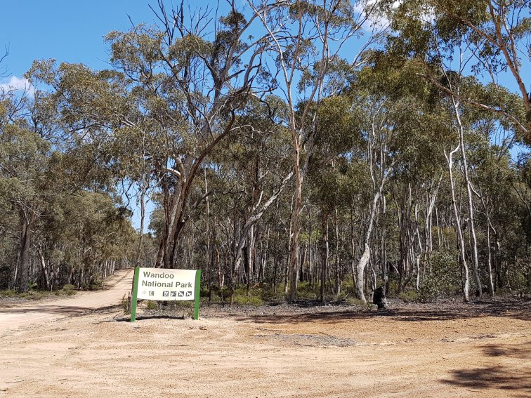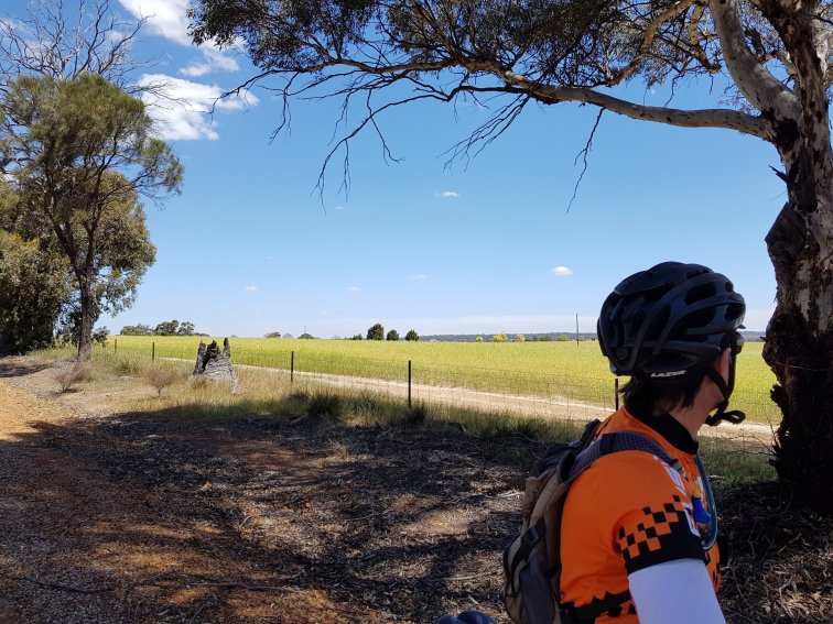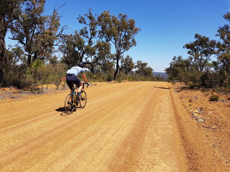 We spent 45 min at this stop, enjoying the shade, food and camaraderie. Finally we decided it was time to make a move – our little trio set off for the next leg. We headed south, did a short section on Great Northern Highway, then turned left onto Helena Road. This was the next gravel secteur, and it was a long one – 20 km for this section. It went through Wandoo National Park, undulating but not too serious. The gravel was quite good for riding, reasonably solid under tyre.