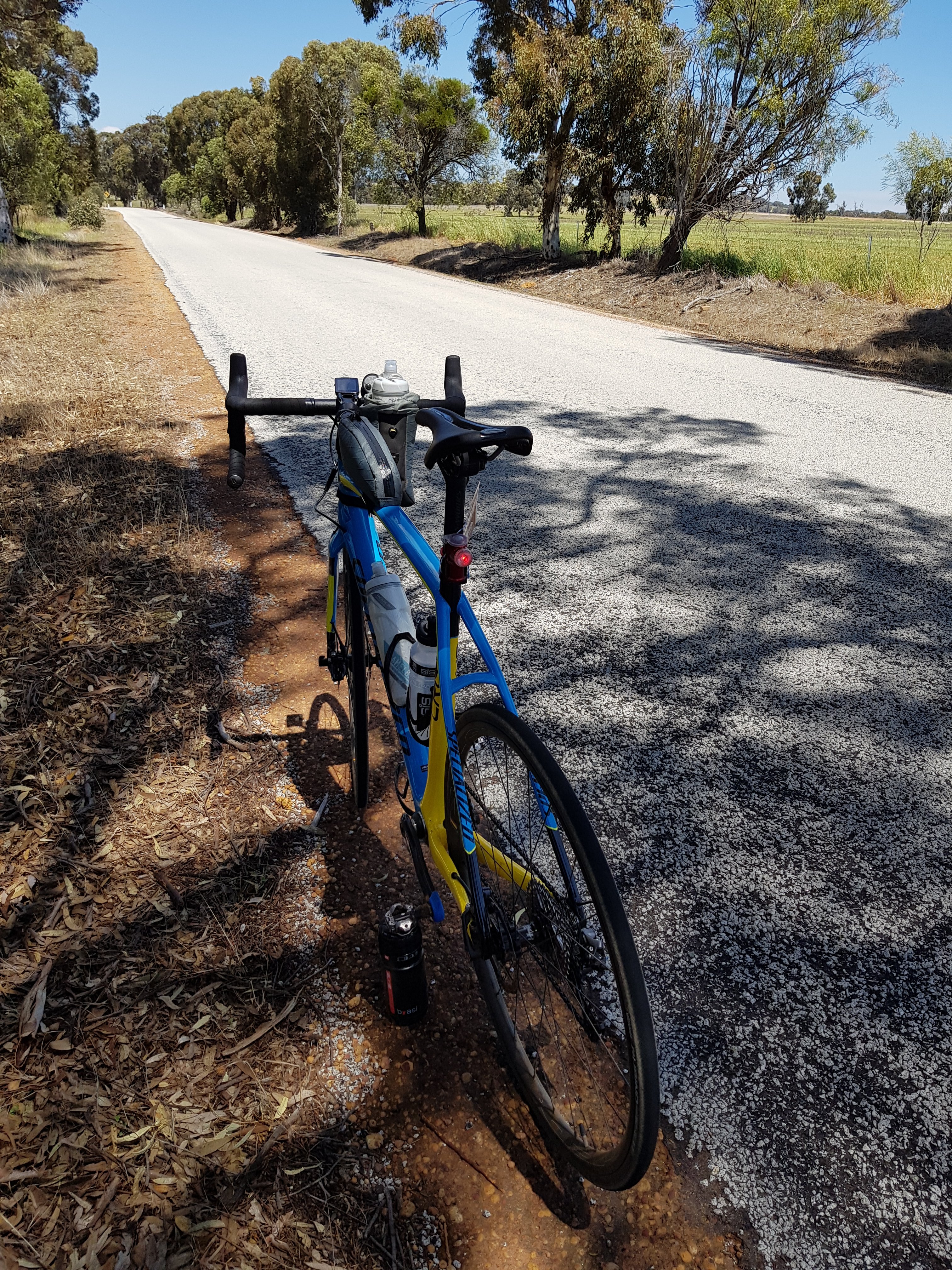 At the end of Helena Rd, we turned left onto Talbot Rd West, which was bitumen. We knew this was the road back to Beverley, and assumed we would follow it the rest of the way. At this point we had done 100 km, with about 30 km of gravel. We were starting to feel the distance, with complaints of sore bums and just not being able to push to hold the wheel. I decided it was time for a rest break – but first I had to catch up to Greg who was about 20 m in front and tell him we were stopping!