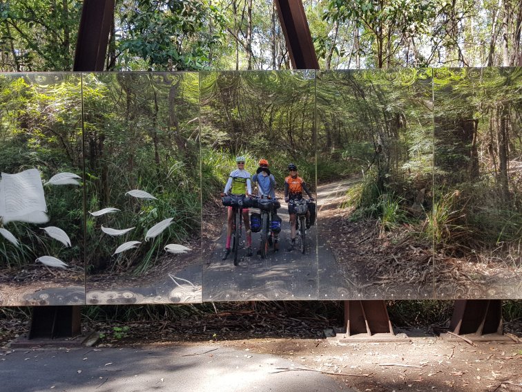 The trail continued mostly on undulating fire trail with a few connecting bits of singletrack. Then after less than 9km we got onto a bitumen section, downhill, and our average speed started to increase from 10kph. However, before too long the bitumen road went up – a tough 1km climb mostly at 15-17% gradient. We got a little bit of undulating recovery after the climb, then turned off to Swarbrick Art Loop, which happened to be excellent timing for morning tea, at around 12km into our 30km ride. We had a morning tea snack, then rolled slowly through the art loop. This was an interesting and very reflective diversion, well worth checking out. We then continued on the trail via a short section of singletrack.