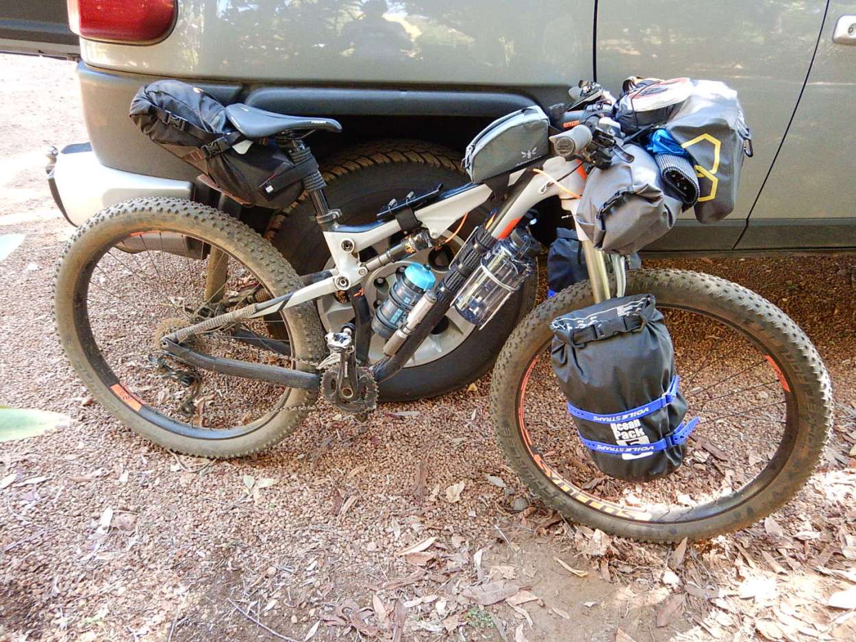 Bikepacking setup: Enormous seat bag (long legs with lots of exposed seat post required), Apidura large handlebar bag with handlebar pocket, two small to medium sized bags mounted on Salsa cages on the front forks, double-adaptor cage mount with two x 1.5L Nalgene water bottles on the down tube, plus one 750 mL water bottle in the bike cage and one in a handlebag bidon bag. Total water carried more than 4 L. No backpack. Oh and a solar panel tied on.