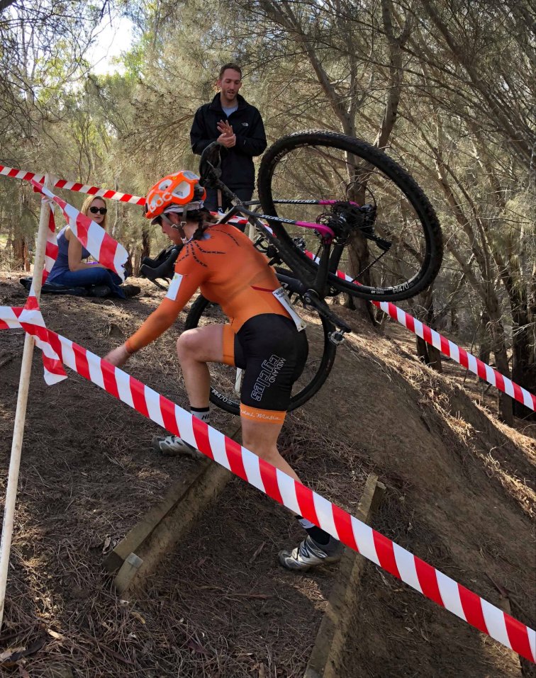 I managed to keep her at bay for most of the last lap. Heading out of the stairs in the last portion of the lap I thought, okay I’ve got this I just need to power out of every corner and I’ll beat her to the finish. Then the wind blew the course tape and it got tangled in my bike. I could feel it pulling me backwards and I had to stop and unwrap it from around my pedal. Miraculously the B grade rider hasn’t caught me by the time I restarted but she was much closer!