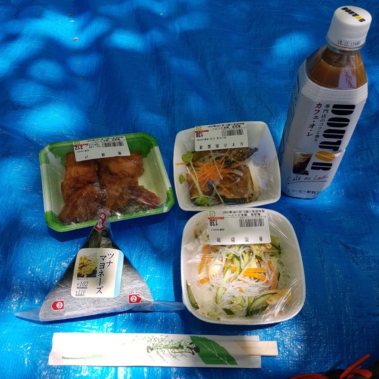 The next morning it is raining when we set out and we are all kitted out in rain jackets. I’ve had a big breakfast from the buffet to fuel me to get through the whole ride and stay warm. Breakfast included fish, scrambled eggs, salad with mayo dressing, seaweed salad, pickles, and miso soup. Followed by two small coffees and a croissant with butter and jam.