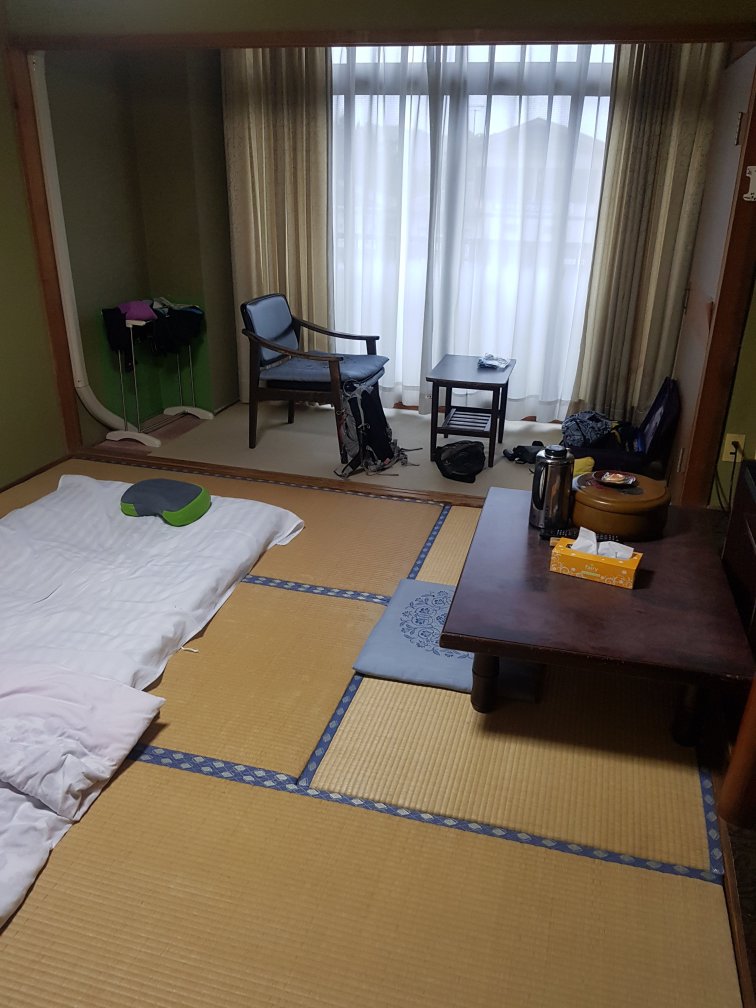 We finish up at a traditional Ryokan right on the edge of the road in a small town. I am first into the shared bathroom. I wash down then attempt to get into the bath but it is scalding hot and I just can’t manage it. After bathing I have some downtime in my room.