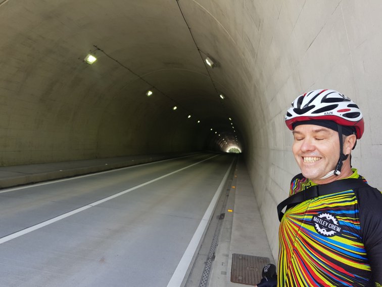 We wait at the top for the others, then I head off first on the descent as Mike is pretty cautious downhill. This road is narrow and in places patched and pot-holed with moss on the centre line so I’m taking it at a safe pace. After a while Alex comes zooming past. A little while later Hans-Willem catches up to me but he seems happy to sit behind me. I am in the moment, enjoying reading each corner, using my mountain bike skills riding out of the saddle to absorb the bumps and steering with my hips. As I reach the more open corners towards the bottom on the descent I’ve got a huge grin on my face. That was really a lot of fun and so pretty.