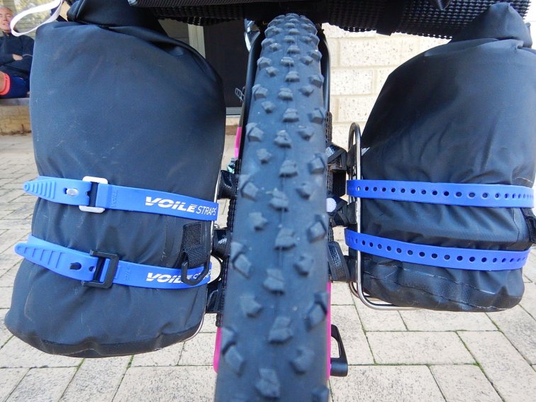 Front forks: SKS anywhere adaptors with King Cage titatium cages and Voile straps. One bag had my Nemo Pillowtop and air mattress plus tracky pants, the other bag had all my cooking gear and food. This worked well. The only change I need to make here is that the SKS Anywhere adaptors have a tendency to slip. I do have King Cage USB mounts, which are much more secure, but they are made from hose clamp and had a round profile, whereas my forks are oval-shaped. I need to figure out a way to make the USB mounts work, or fashion something similar to use. I do use non-slip matting behind the mounts as well to protect my bike.