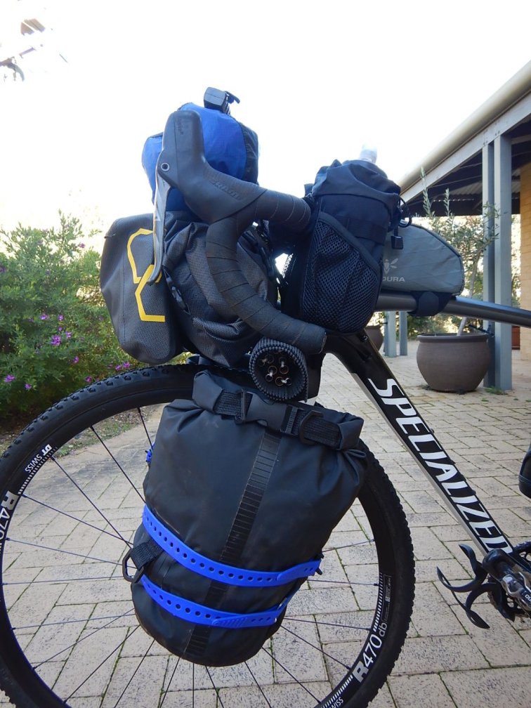 Handlebar bags: Apidura handlebar bag and front pocket. The handlebar bag had the remainder of my clothes, in compression bags, and the pocket had various bits and pieces for easy access. Underneath my drop bars I had my tent poles tied on with the handlebar bag bottom mount. This setup worked really well, but I had to tighten the straps on the handlebar bag as much as I could and then cinch it up a bit higher with voile straps so that the straps on the base of the bag didn’t rub on my front wheel. I also had my sneakers strapped onto the top of the handlebar bag in a separate bag. There is actually about 1cm of clearance between the fork bag and the handlebar bag, although it doesn’t look that way in the photo!