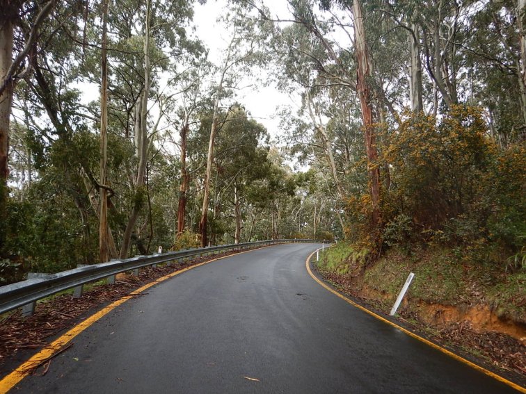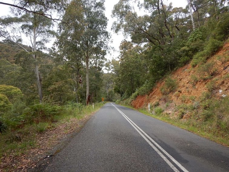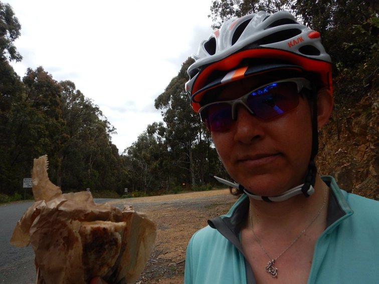 At 80km into the ride, I reached the meaty bit – the 20km climb up the Great Dividing Range. From my route map, it looked like it was pretty much uphill the whole way, with one downhill section at the halfway point. So my plan was to stop at the halfway point and have something decent to eat. At my previous rest stop, I had also made up a drink bottle with half coke / half water. Thanks Greg for this tip – it was not too sweet, with enough kick to give me a mental boost. So up the climb I went. It started off at a pretty gradual gradient, even with a few flat or downhill sections in the first couple of kilometres. Then there were a few pinches that were quite steep – I mainly focused on the road a few metres in front of me and just kept breathing and trying to stay relaxed. The road was quite twisty with a few switchbacks, so I was able to select a line around the corners that eased off the gradient, which helped tremendously. About halfway up the first section, my back started feeling like a vice all across my lower back, and I really wanted to stretch. Eventually I found a section of road that was flat enough that I’d be able to start going again if I stopped, and where I wouldn’t be run over by cars coming around the corner. I stopped for a short stretch then kept going.