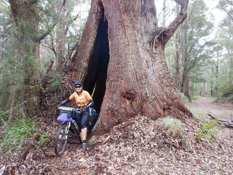 After a delightful picnic lunch, we were faced with probably the toughest climb of the day. It got up to at least 11% gradient, which is a lot with 12+kg of luggage. Those of us with easier gears were able to ride up the climb with some determination. There were a few tough climbs in succession, all on double track/ wide trail. We continued on these unsealed roads through the forest, briefly venturing onto a sealed road right near the Valley of the Giants treetop walk at about 28km. We had seen a few spectacular tingle trees along the ride, with huge burnt out hollow bases.