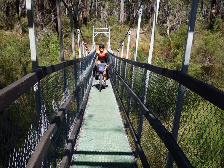 As we got close to Albany, the Munda Biddi signs became uncharacteristically confusing. We consulted our hard copy maps and GPS maps and a local guy on a bike and eventually figured out where we had to go – we had to lift our bikes up some stairs and over a railway line! My wrists were a bit stuffed from the flat handlebar position so I stood looking at my bike in disbelief for a few minutes trying to muster the will to manhandle my bike, then Greg was a gentleman and carried my bike for me.