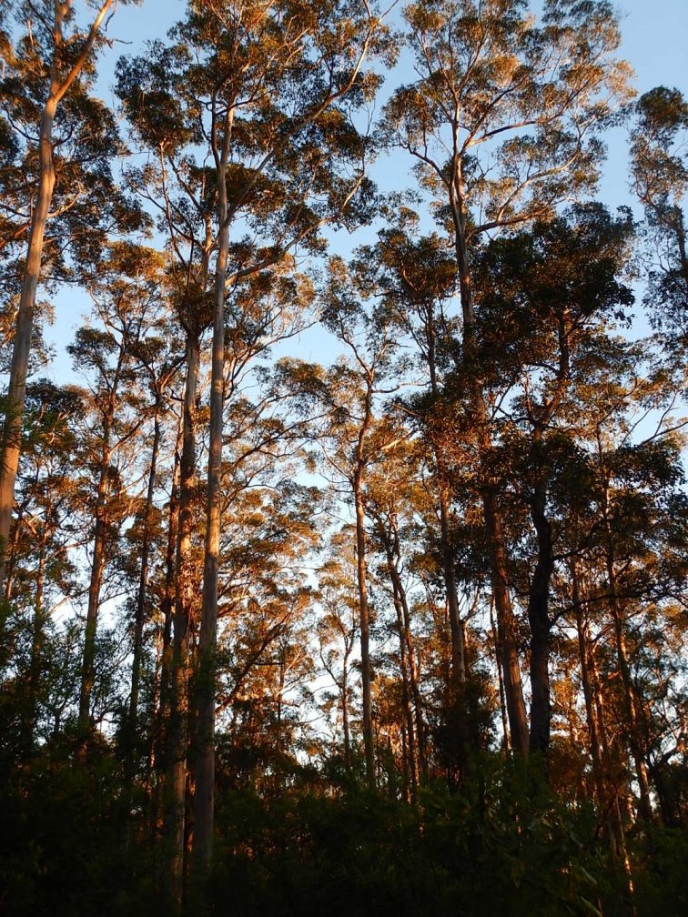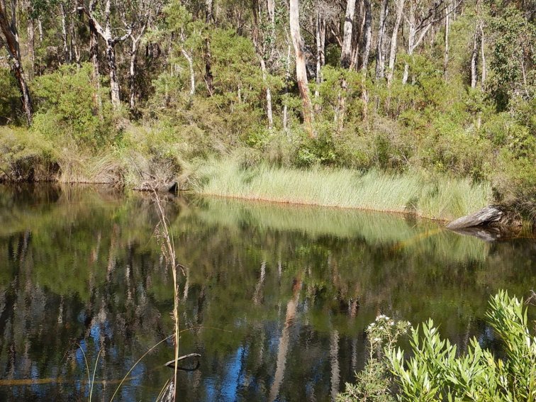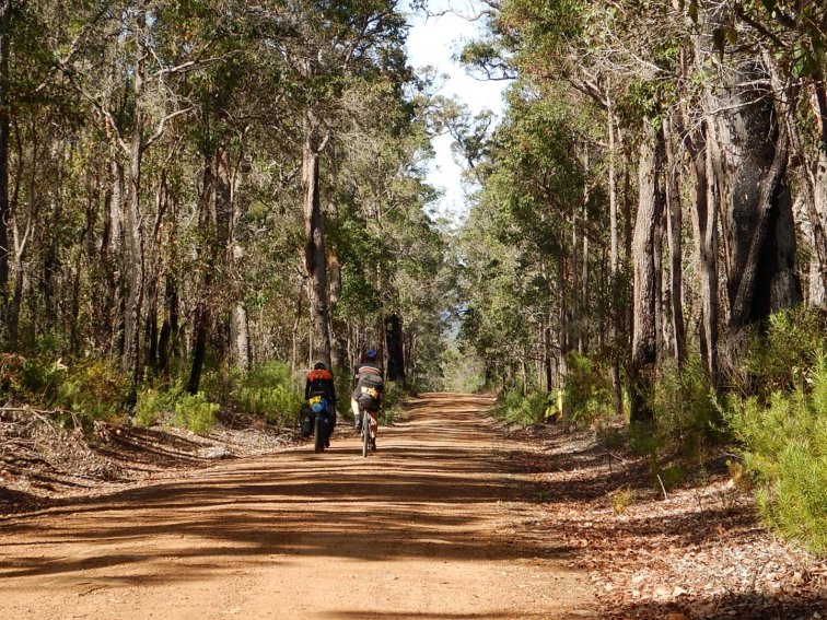 We left Walpole at about 10:30am on a coastal track winding through tall grass and trees. After about 4km we crossed the South Coast Highway, and we immediately entered the forest with beautiful tall trees all around. It was a bit of a switchback climb here, but a gentle enough gradient to enjoy. At about 12km we went close to Nornalup, and from here to 19km we followed the Frankland River on an undulating section of double track. We stopped at about 15km for a lunch break. It was already after 12pm – we had quite a few stops in the first 10km sorting out luggage fine tuning to stop things rubbing.
