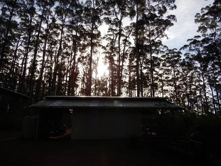 Eventually we arrived at the campsite at 53km, at about 5pm. There was a family with two kids already at the hut, they were riding the same section of trail as us. We all set our tents up away from the hut, then got dinner. It was an incredibly calm evening, no wind, very quiet. The weather during the day had been good, no rain at all, just quite cold. And very cold overnight! I was snuggly warm in my tent but did have on more layers than usual, including track pants and long sleeve merino top all night.