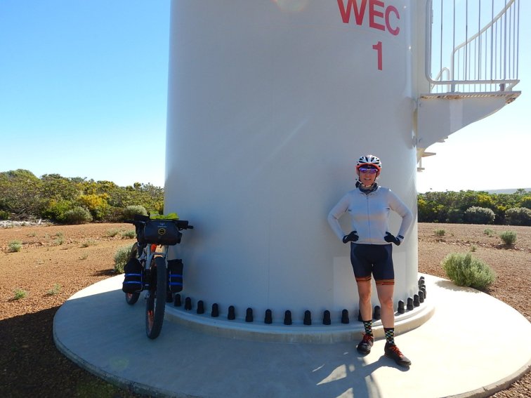 At Lights Beach we linked into the Wilderness Ocean Walk (WOW) trail, which was mostly sealed fine blue metal and very undulating! Lots of short steep climbs, which was an effort with my luggage and sickness (cold). Good thing we had spectacular coastal views to distract us from the effort. After a very long 6km we finally reached the wind turbines at the end of the trail, it was a relief.
