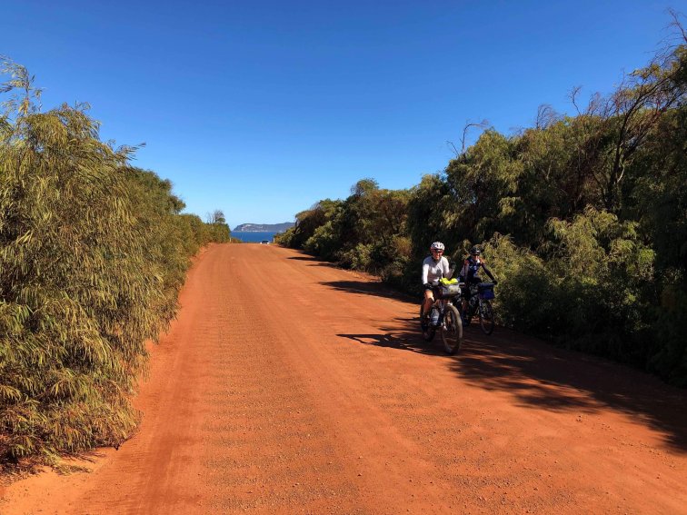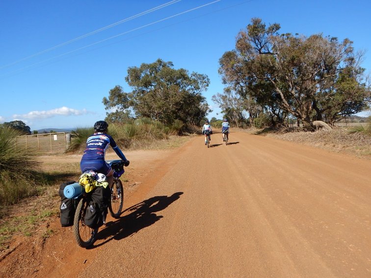We set off at 10:07am – Annie and I got up last at 7:30am and were ready first at around 9:30am. Those who were up before 6:30am were last ready! We headed out of the camp site then downhill on a road and onto some sand. Thankfully due to the rain a couple of days ago the sand was quite compacted. There was a lot of sand in the first section of trail today. Then there was a lot of corrugated gravel road. We even had several cars passing us on the roads today. And our lunch stop (12-1pm) was along the side of a road, not very picturesque and a couple of cars went past as we ate. It wasn’t too dusty thankfully.