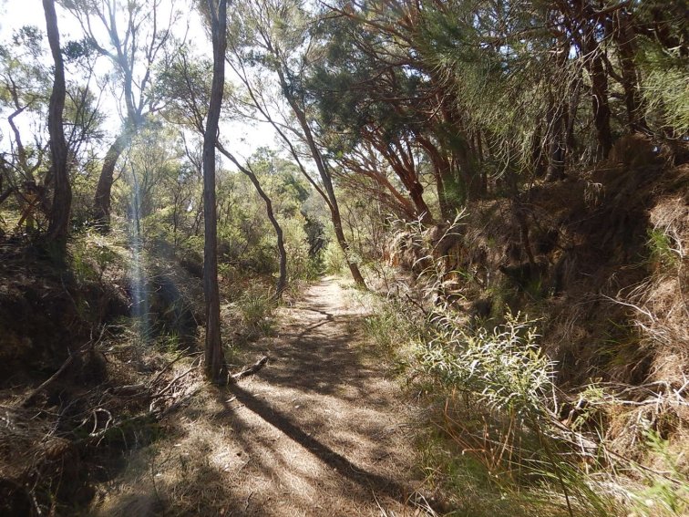 After lunch, we got onto a track that wound through the dunes to Lights Beach, which was quite a nice trail. It was mostly red gravel with some sections of interlocking plastic mesh over the sandy bits, through some dense vegetation.