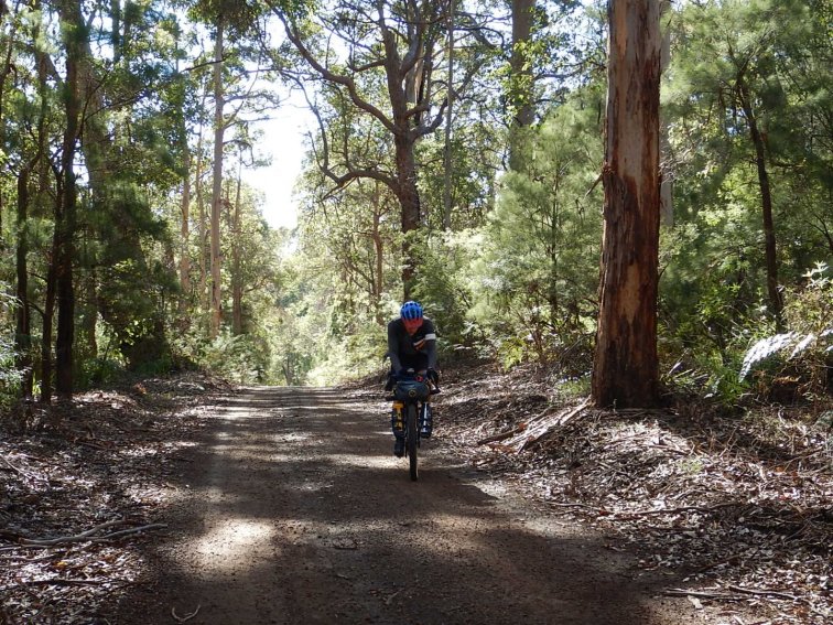 Leaving the camp we were on singletrack descending through bush for the first couple of kilometres, then it was onto an unsealed road for two kilometres before we turned right onto Scotsdale Rd. We continued on (bitumen) Scotsdale Rd for about 3km (uphill) then turned left onto an unsealed road, which continued uphill for another few kilometres. There were quite a few sealed and unsealed roads today, but it was more enjoyable than yesterday as the gravel roads weren’t corrugated. Plus it was fun because we were pretty close to Denmark the whole day, in areas that I was familiar with, but I also got to explore some new roads and trails that I’d not done before. Although it had started off quite cool in the bush, it was a sunny day and got to a quite warm maximum of 28 degrees.