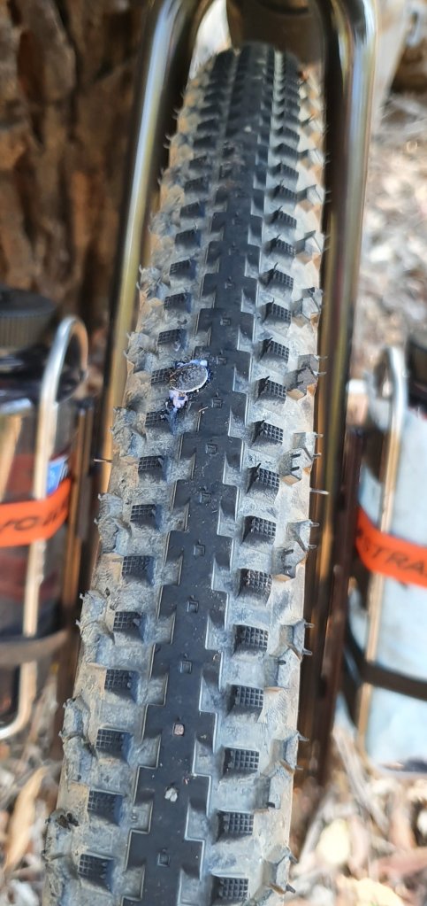 We got to the end of the gravel onto Perup Rd (bitumen). I was very happy to see a giant hill climb up the road to my left, the direction we had come from, which we had not had to do. So maybe the undulations weren’t too bad. On the bitumen I started riding in my aerobars. I could hear some strange ticking noise coming from near my front wheel. We were both tired so we stopped for a snack of a donut and checked out my wheel. Turns out there was a nail jammed in the tyre. The sealant had done a reasonable job of sealing it so we left it and continued.