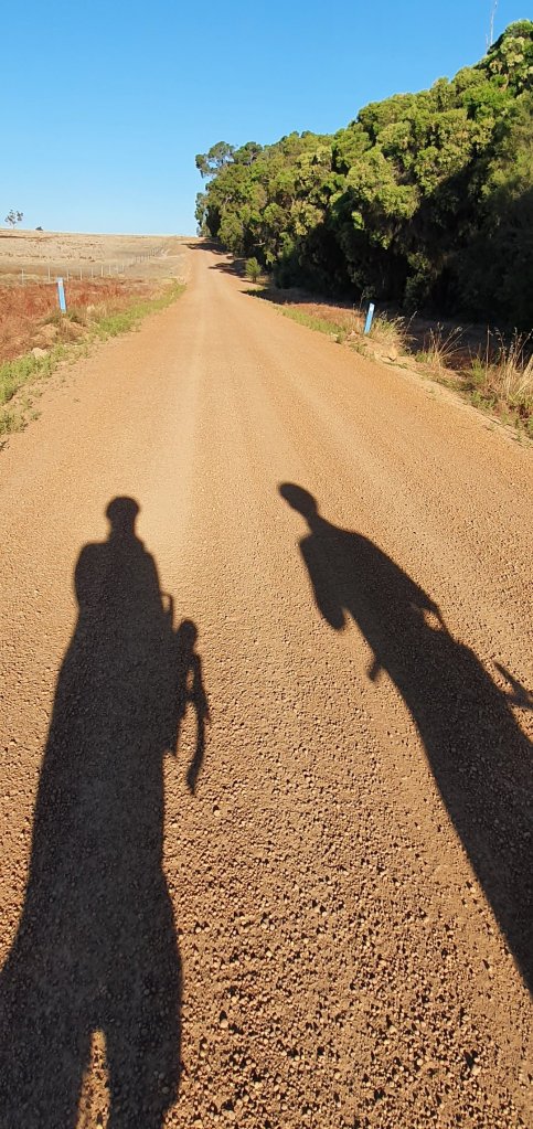Started riding about 12:30 pm. A few km of bitumen then onto corrugated gravel, although it became better as we got further from town. Our route took us (on a named road) through a gate into a “private property” tree farm. Although the other end of the road had no gate! After leaving the tree farm the gravel became semi soft sand, rideable but sucked the wheels. Then there were big sections of rocky and bumpy gravel. It was also way hotter than forecast, the mild 28 degrees had become 35+degrees in the sun on the bikes. It was a relief to reach Muir Hwy.