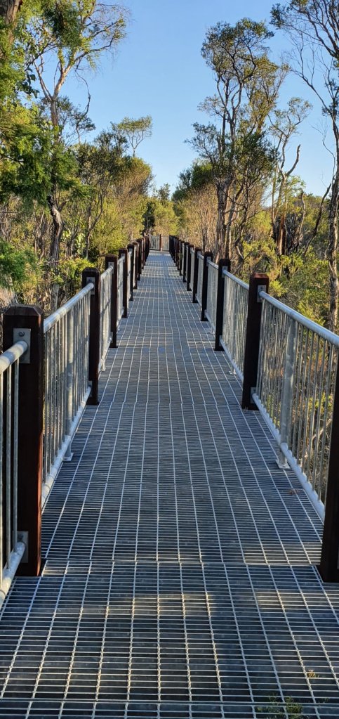 We got to Muir Hwy, did about 500 m and reached the Lake Muir observatory. We came in to check it out and decided this is where we are staying tonight. There is a toilet with toilet paper, a tap fed from a small rainwater tank and it is quiet. The lake is dry so there seems low risk of mosquitoes, frogs and other noisy things*. And the observatory platform has a nice under cover area that seems good as a camp site*. We stopped about 6pm, having done 78 km at 18.7 kph moving average. I ate a bunch of apricot slice things and a muesli bar, and drank about 1L on the bike (total). Dinner was an apple, a ham and cheese toastie and about 500mL of water. I was a bit dehydrated and drank about another 500mL overnight and with coffee in the morning.