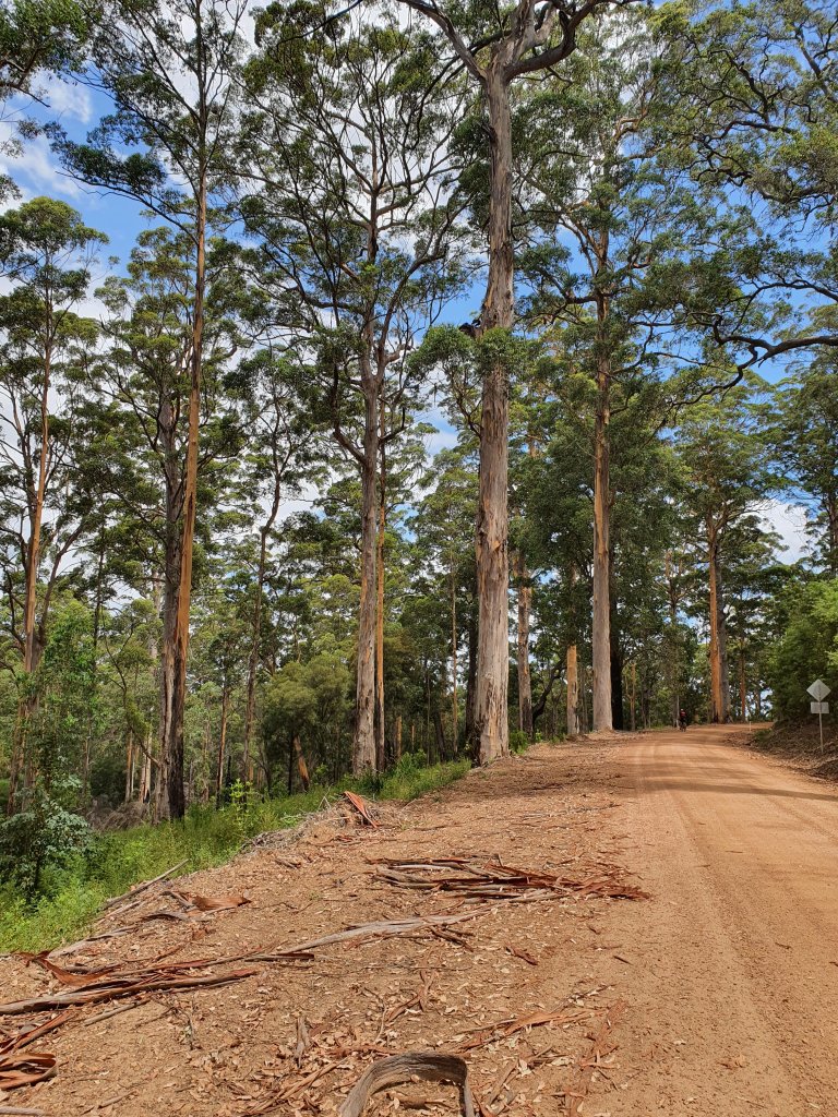 Back to the bikes and back 7 km of corrugated road. With a pause in the middle – Greg realised he had left our Personal Locator Beacon at the top. He flagged down a car and they were nice enough to go find it and bring it back down to us. So much faster than trying to cycle the 1.5 km climb back to the top! Back at the “main road” intersection, we had already decided we would abandon the planned route which took us on a 40 km loop south then back north. So we headed directly east on a shortcut to get back to South West Highway. It was still gravel but it started out nice and smooth and had glorious views of tall trees and bush.