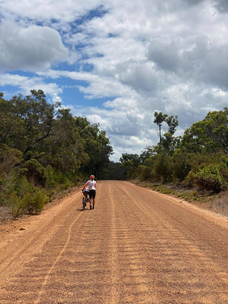 Finally we reached South West Hwy. The original route had us going off into the gravel unknown for another 50 km or so towards Northcliffe. By this time it was 4 pm and I couldn’t face any more corrugations. Greg found the Shannon National Park camp ground on maps, which was some 30 odd km up the highway, but just off the highway. It was decided. So we rode a very undulating 30+km. It was a relief to be on bitumen, on road that didn’t move underneath you or try to buck you off the bike. But I was still very tired and my hands were so sore from being braced on my bike hoods all day. But my legs still worked and I kept up a steady supply of peanut m&ms and water for fuel and we made it before 6 pm. Winning! There are hot showers and flushing toilets and camp sites under the pines. Today was around 110 km (Garmin seemed not to record some of the walking), a bit over 10 hours elapsed time. I drank 2L of water (it was a mild mostly overcast 20 degrees day). Plus a large cold brew coffee at breakfast. Food for breakfast was paleo muesli with a banana and 100mL of milk. During the day I ate the reminder of my apricot slice, about half my peanut m&ms, two salami and cheese wraps and two muesli bars. Dinner was a foil packet of tuna and beans, half an avocado, a slice of cheese and a wrap. It was all delightful and sufficient, although I’d love a square of dark chocolate after dinner. We were chased into the bivvies again tonight, this time by rain. Thankfully it didn’t last too long so I could open up my bivvy window.