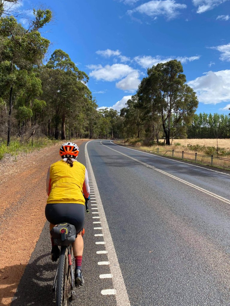 Today we took South West Highway all the way back to Manjimup. It was 55 km all up. The original plan had been a gravel route but we weren’t interested in that. Traffic was generally pretty quiet until the last 15 km in to Manjimup after the Vasse Hwy intersection. It was a bit drizzly for the first 5 km or so, which gave me the chance to test out my new Velocio rain gilet – it was excellent! High visibility, breathable on the climbs and warm on the descents. And there were lots of climbs and descents – very undulating pretty much the whole way. A lovely ride though, scenic tall trees and legs felt pretty good. I slept well last night after a tough day yesterday so I felt good today.
