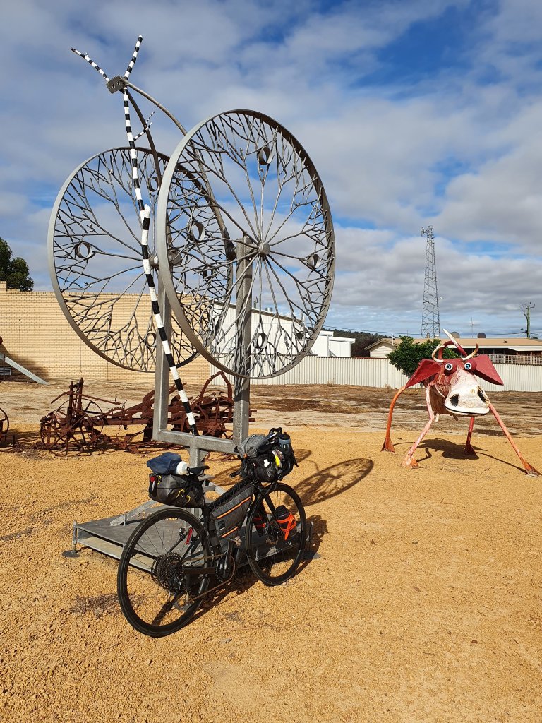 Reaching Boddington, we stocked up supplies at the IGA. I grabbed a few fruit squeeze packs and croissants and a fancy lemonade, and ate a yoghurt straightaway. Boddington was a lovely town with a very impressive collection of metal sculptures in a couple of parks and other random places.