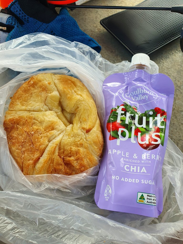 The rest of the day was a pretty long drag. It was mildly warm (max 28 degrees) but that touch of heat plus no real towns plus a really long day made for monotony. We both listened to audiobooks / podcasts for much of the day. Food included ham and cheese toasties (brought from home) and a Mary Street bakery passionfruit curd donut. It held up on to two days in a bag and was devoured in mere seconds. A welcome energy boost.
