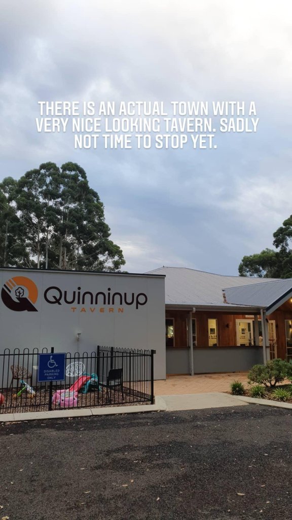 We eventually reached Darkan with hopes there may be an open roadhouse for a sweet treat or cold drink. No such luck – but it was Good Friday at 4pm, so it wasn’t surprising. There were public toilets with a water fountain and tap, which was great – we both filled up and used the water and it was delicious.