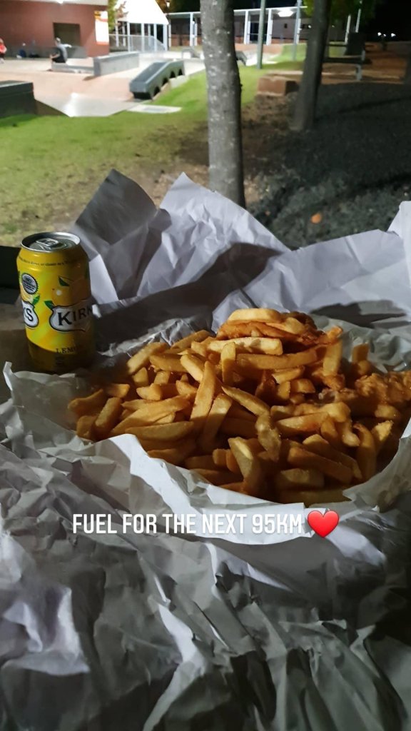 We arrived in Manjimup at 7:30 pm, ordered fish and chips (best fish n chips around!) and took it to the Heritage park precinct to dine. Fully lit at night with a few families and kids using the skate park, open public toilets, and a filleted water fountain. We filled at our water bottles here (some had been carried empty from the start) as there were few water stops for the next 200 km.