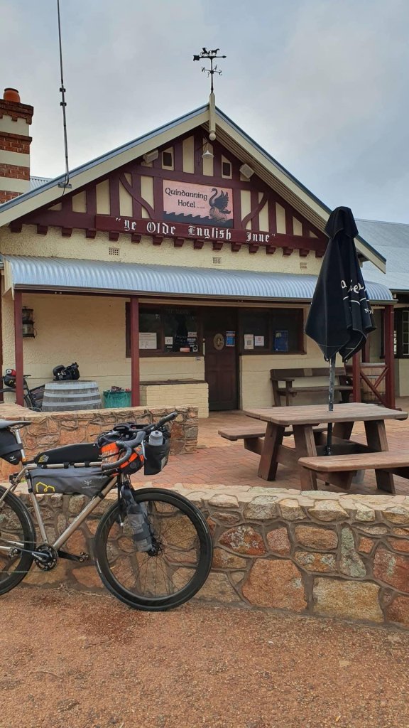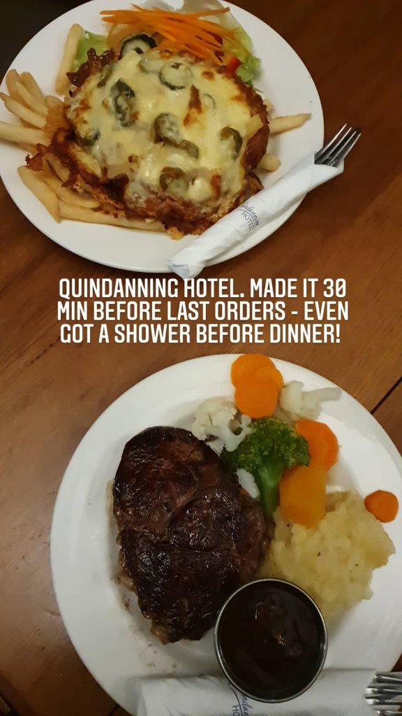Nevertheless, we averaged 30 kph for the last hour and reached Quindanning Hotel at 8 pm, 30 min before food orders closed. The staff were lovely, we checked into our small room (single storey = ground floor), had a quick shower in the shared facilities, grabbed a drink and a table just as our meal was ready. I had a pint of lemon squash and a solid pub meal of steak, mash and veg. We were so tired, straight into bed after dinner, by which time it was 9:30 pm.