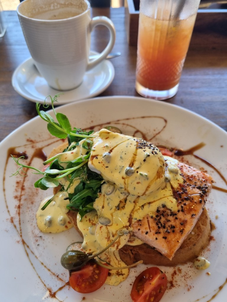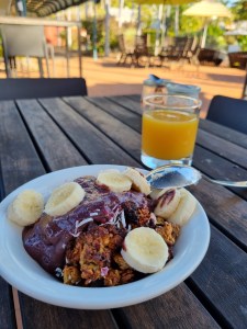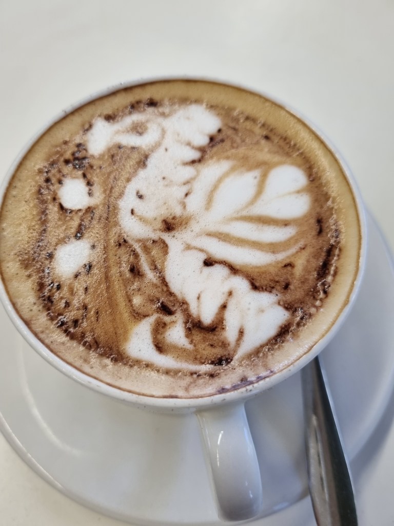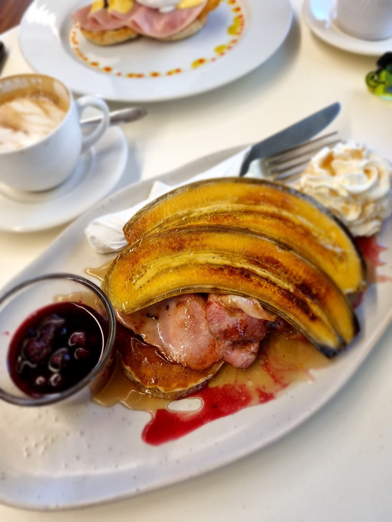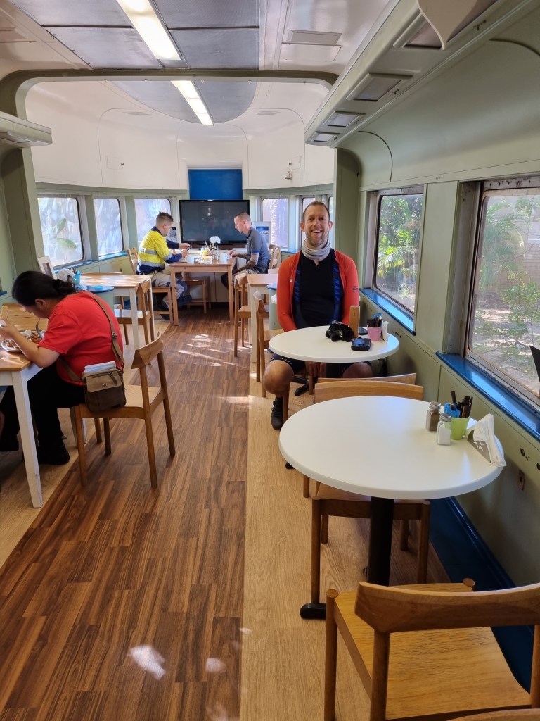 After a bit of a sleepin, we decided to follow the gist of the route I had plotted and see the town proper. I didn’t intend to ever go back to Port Hedland, so I figured we should see it while we were here. I had scoped out a cafe sort of near our accommodation that looked good, but in our investigations of the town we found a train carriage that had been converted into a cafe! As Greg is a mad-keen train fan, it was quickly decided that we would have breakfast there. Our first barista coffee and cafe breakfast of the trip, and it was a good one! My coffee had seahorse coffee art, and I got ricotta hotcakes with fried banana, bacon and maple syrup. Yum!