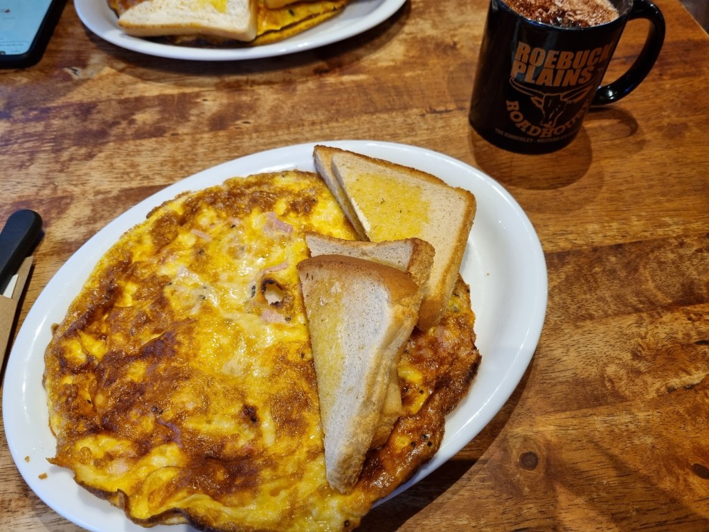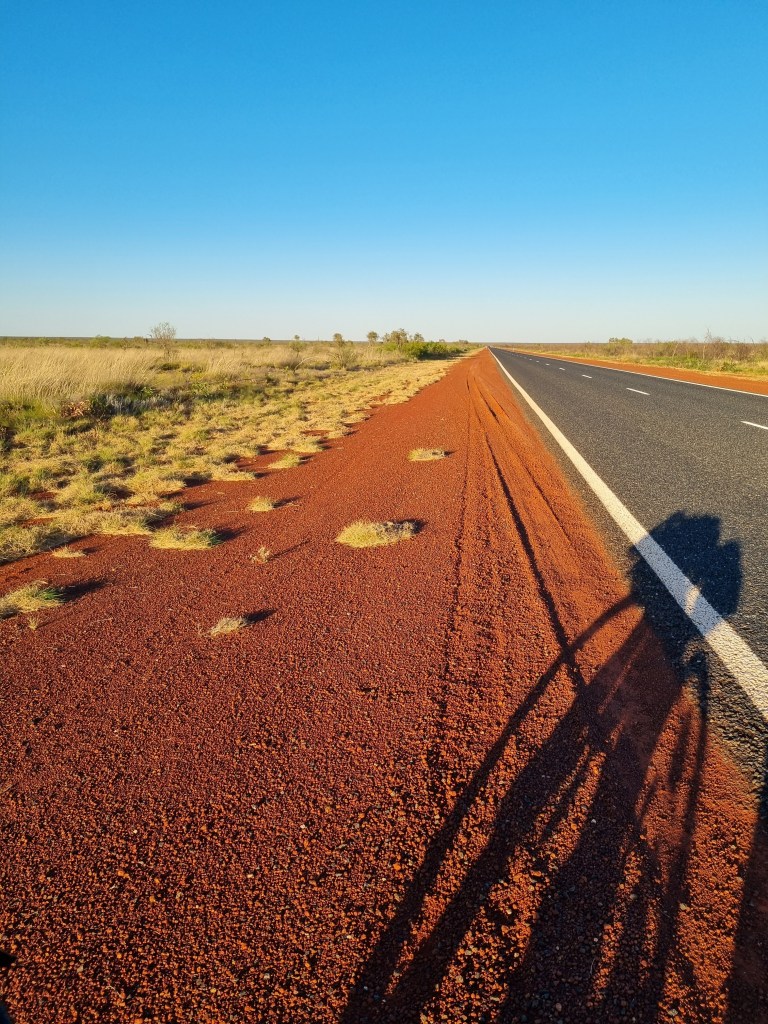 We were up at 4am and set off at 5:20am, with breakfast consumed in the hotel room. We rode the 30km to Roebuck Plains Roadhouse, heading into the sunrise, and enjoyed coffee and a large second breakfast at the roadhouse. Great to have a menu for cooked-on-demand meals and gluten free bread – I had no idea how rare this was to be at other roadhouses.