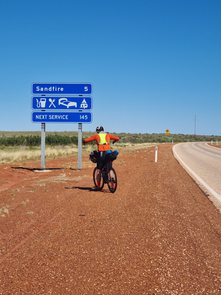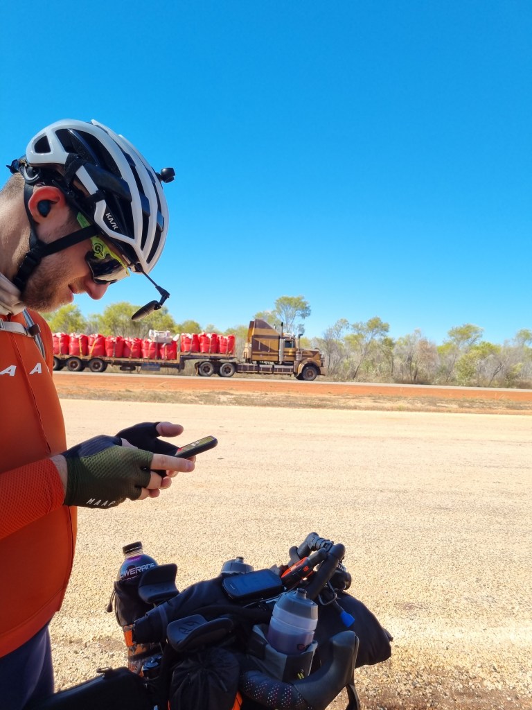 The wind had been relatively mild in the early morning hours, but quickly picked up to a reasonably strong crosswind. It was slow going for 120km until we got to Nanuturra Roadhouse. We both had our headphones in and heads down just trying to keep up momentum and motivation. Whenever I glanced at the speed on my bike computer it was under 20kph, and what felt like significant sections were under 15kph. This was in contrast to much of the previous days, where a moderate tailwind had kept our cruising speed up around high-20’s to mid-30kph.