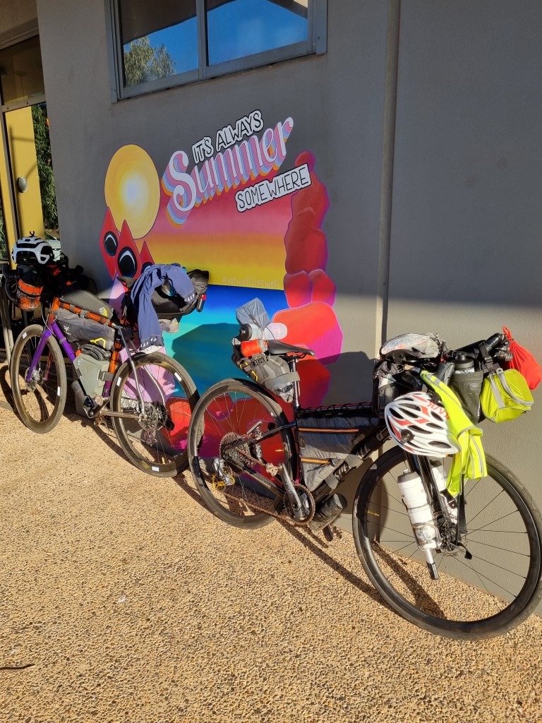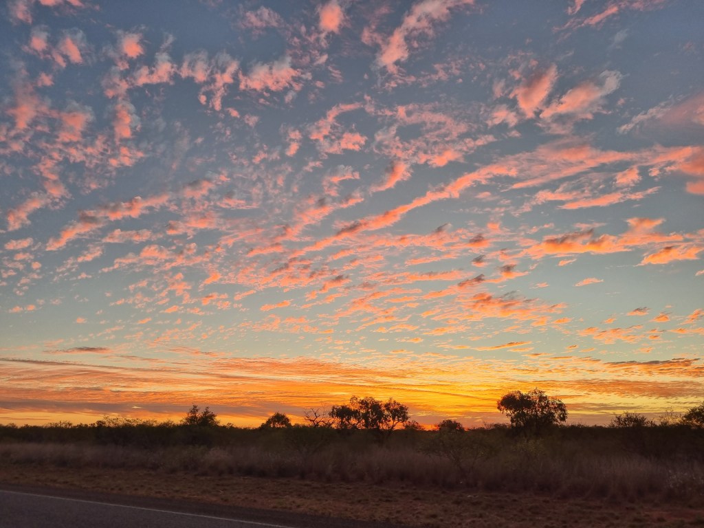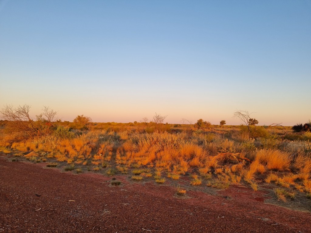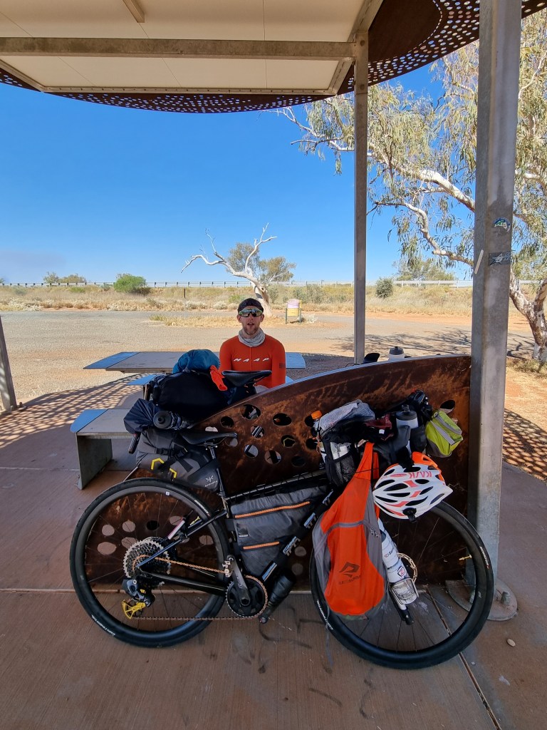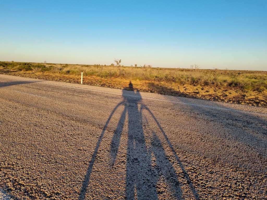After we left Nanuturra we turned slightly more westerly and the wind became more of a tailwind. This picked up our average speed, so that by the end of the day we had averaged a remarkable 19.7kph. We arrived at the underwhelming Yannarie Rest Area just before sunset – we had seen the moon set and sun rise in the morning as we rode, and now we were seeing it in reverse at the end of the day. I did a quick wash of myself and change of clothes in the toilet, sprayed on the bug spray (mandatory for me at most places) and then prepared dinner – our usual pre-cooked rice, foils of tuna and half an avocado. After dinner, Greg washed the large collapsible mugs, and I filled them with water and coffee bags for breakfast. While we ate, we would do our daily spotto and I would write down my food and drink for the day. Then we tried to brush as much gravel off the concrete as possible, set up the bivvies, and went to bed.