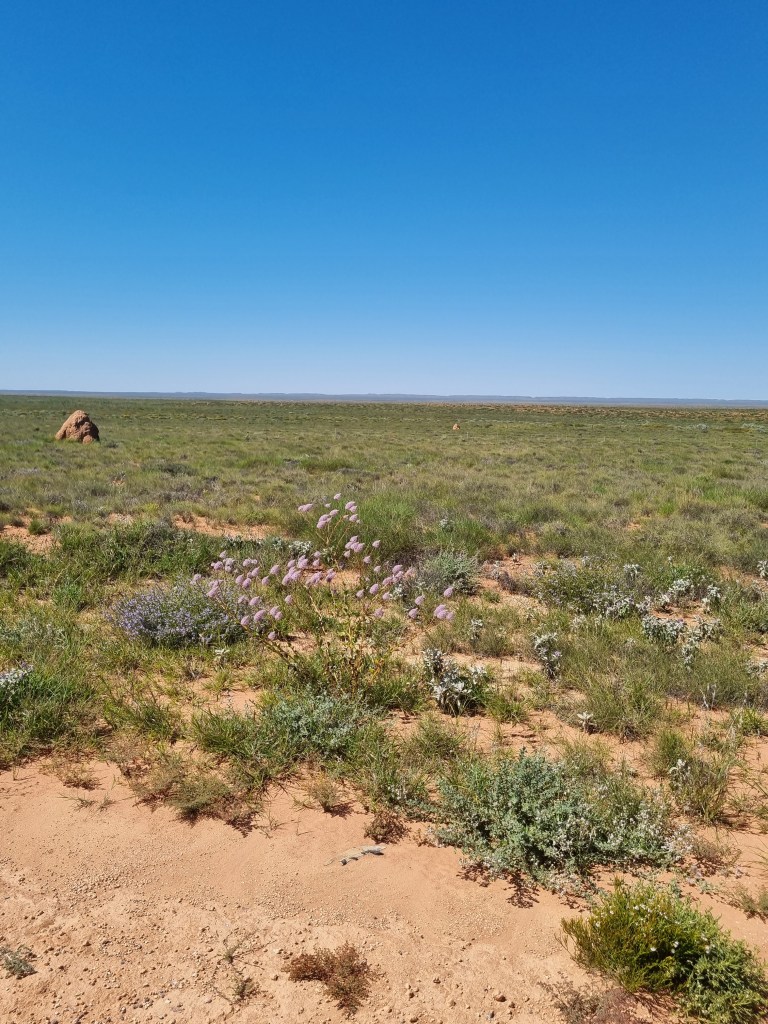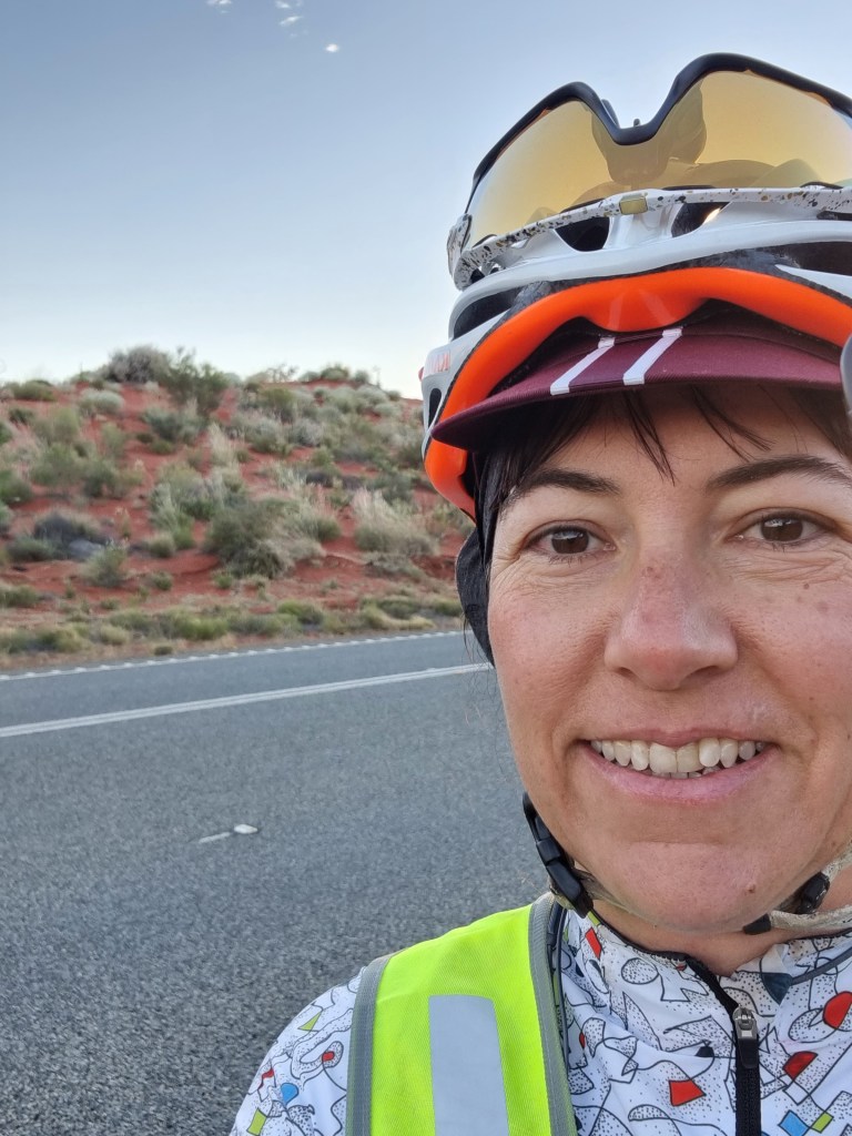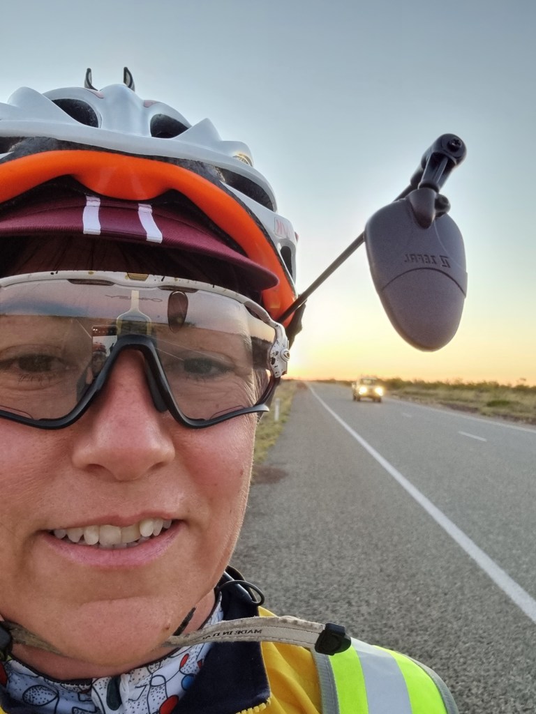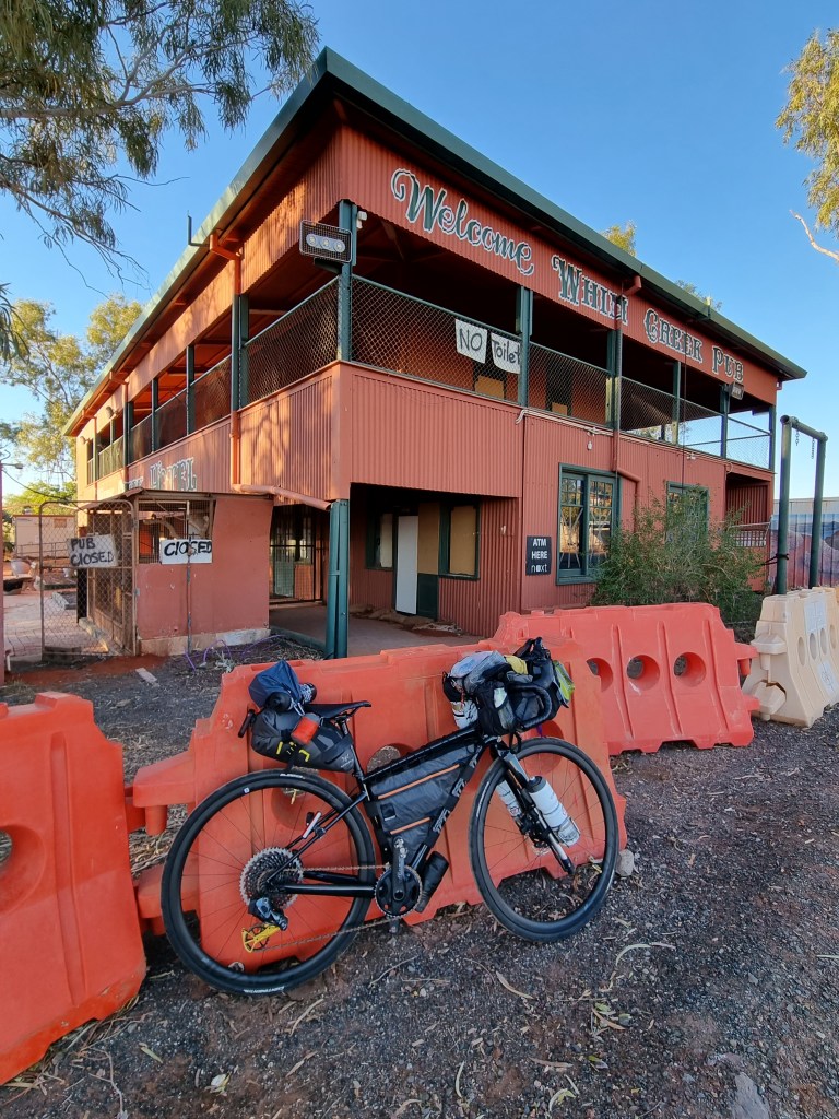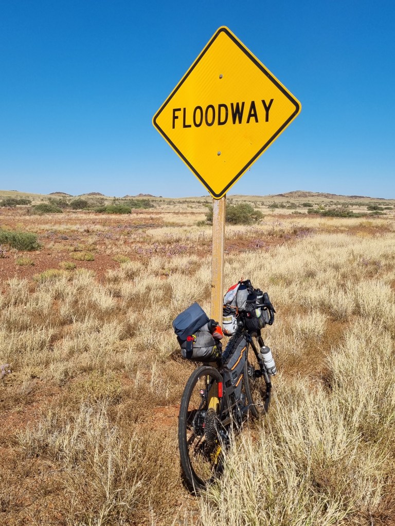 After we left Nanuturra we turned slightly more westerly and the wind became more of a tailwind. This picked up our average speed, so that by the end of the day we had averaged a remarkable 19.7kph. We arrived at the underwhelming Yannarie Rest Area just before sunset – we had seen the moon set and sun rise in the morning as we rode, and now we were seeing it in reverse at the end of the day. I did a quick wash of myself and change of clothes in the toilet, sprayed on the bug spray (mandatory for me at most places) and then prepared dinner – our usual pre-cooked rice, foils of tuna and half an avocado. After dinner, Greg washed the large collapsible mugs, and I filled them with water and coffee bags for breakfast. While we ate, we would do our daily spotto and I would write down my food and drink for the day. Then we tried to brush as much gravel off the concrete as possible, set up the bivvies, and went to bed.