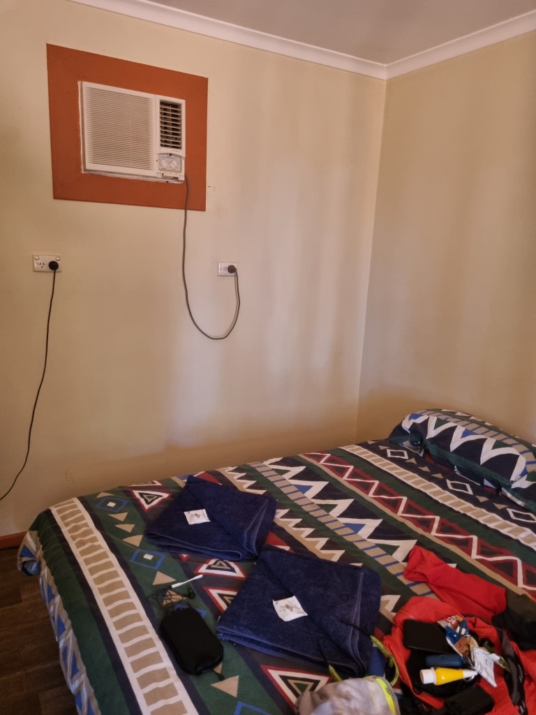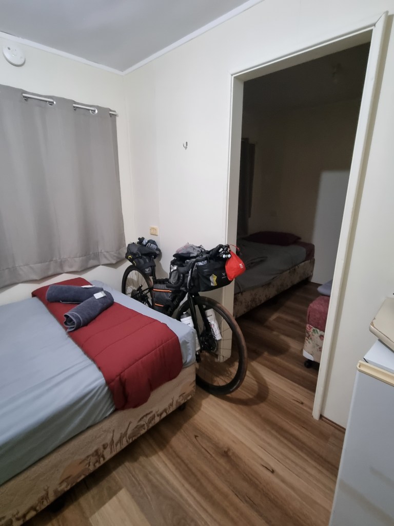 We arrived at Pardoo Roadhouse just before midnight. Greg had phoned and pre-booked accommodation – another $150. They said we had room 13, which would be unlocked, or the key would be in the door. The accommodation at Pardoo is a donga-style caravan park behind the roadhouse. We cycled on a dirt road and then wandered around with our bikes through the grass, looking for room 13. By this point I could hardly walk, as I had severe shin splints and my legs were so sore. We found room 13, but it was locked and there was no sign of a key. We continued wandering, wondering if there was another room 13 somewhere. We got barked at by dogs. We went around the front to see if there was a map or someone to call. As a last ditch effort, we went back around to the caravan park and I started trying doors. I found a door that opened – it was room 14/15, next door to 13. It had beds. That was enough. Toilets and showers were shared – the shower cleanliness and amenity was so poor, and I was so tired and grumpy, that I opted for no shower. Finally I was in bed sometime after 12:30am, with the alarm set for 4am the next morning.
