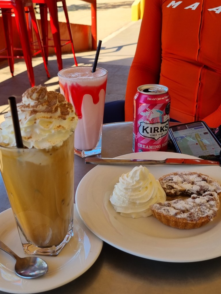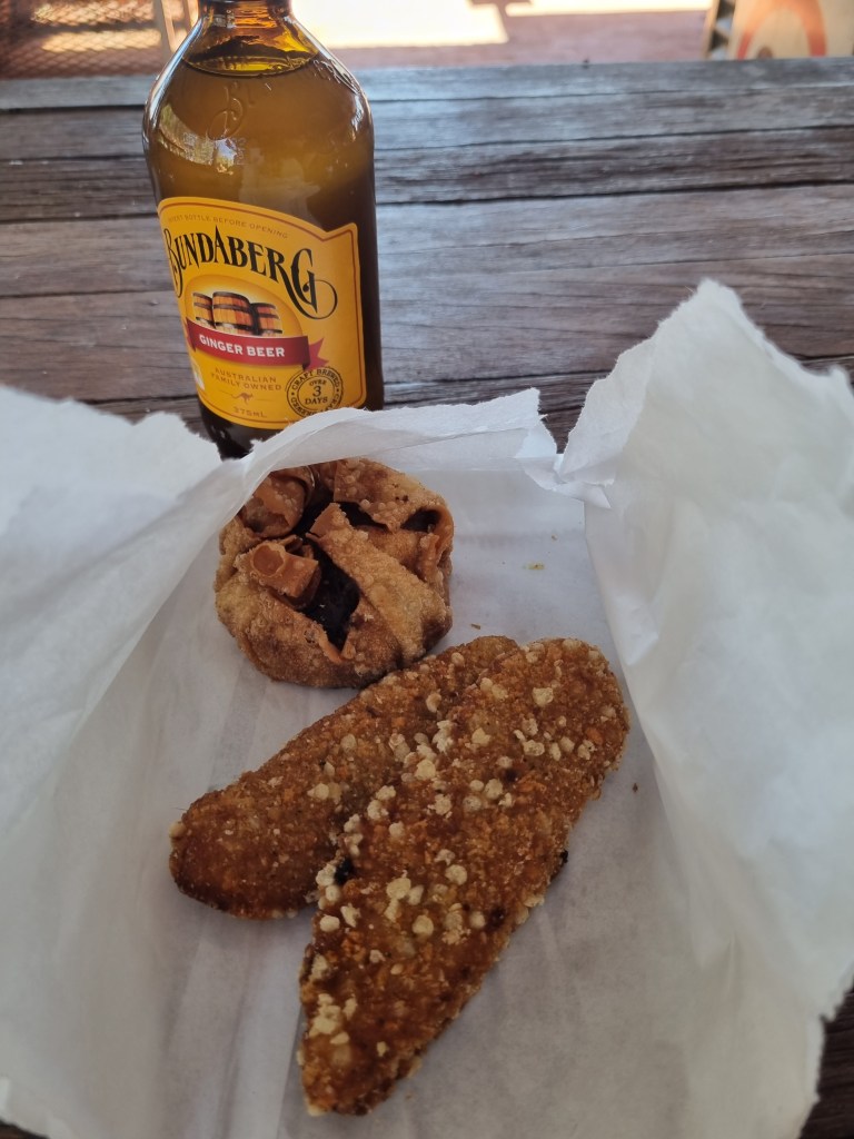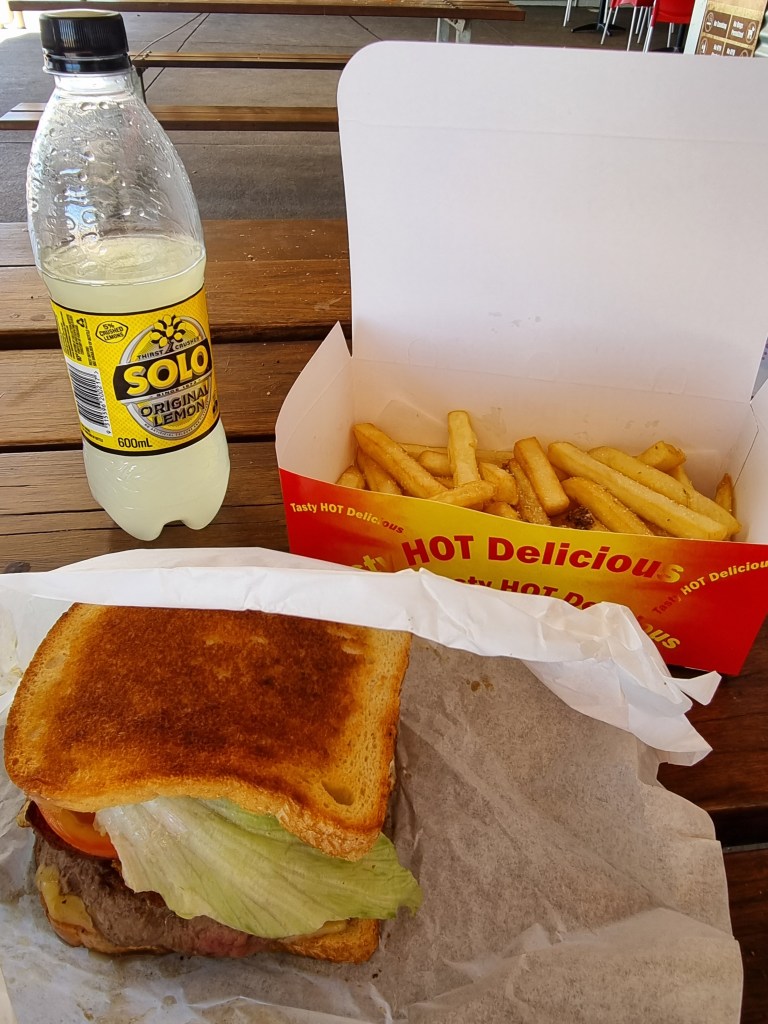 The weather was still pretty hot and I enjoyed a Kirks lemon squash with my bagel at the roadhouse. The Kirks lemon squash and Bundaberg ginger beer were my favourite refreshing pick-me-up drinks on the trip – I also grabbed a ginger beer, which I carried in my insulated bidon bag to the campsite for a sundowner with some pringles. The sundowner became a bit of an end-of-day tradition when we could.