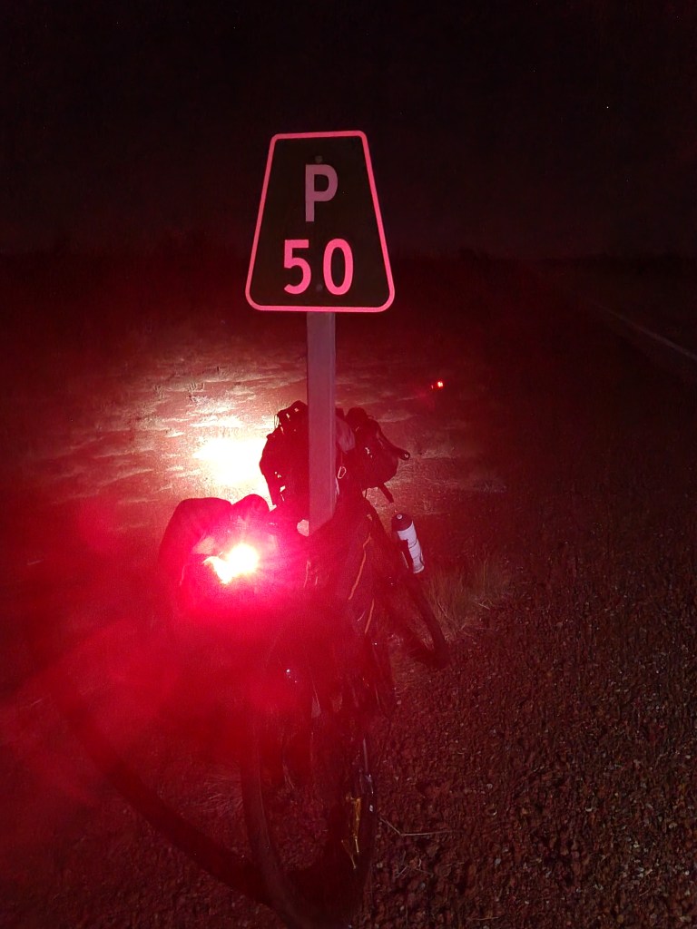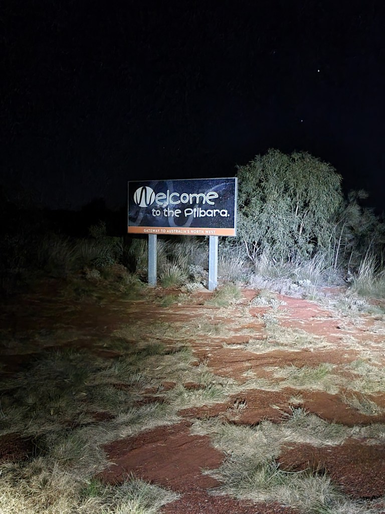 We stopped frequently, often at the town distance markers which were spaced 10km apart. These are way larger than they look when travelling past! One of our stops was at a roadside parking area, where we had chats with a couple in a caravan who had set up for the night. They probably thought we were crazy, but they were also baking hot in their caravan! Greg started to struggle more towards the end and I got some nice night sky photos while I was waiting for him as we neared Pardoo. We entered the Pilbara as we approached Pardoo.