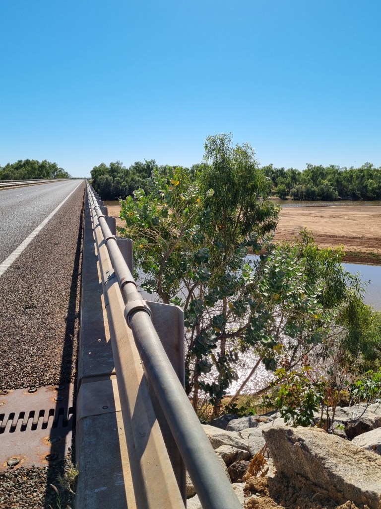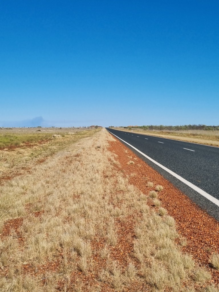 We turned south as we left Roebuck Plains, heading towards Stanley Roadhouse as the first sign-posted landmark, although we wouldn’t reach there until tomorrow. It was interesting looking at the vegetation and wondering how much it would change over the coming days – the shrubs were taller than I had expected. Pretty much all the traffic was roadtrains and caravans, but it was relatively sparse and they all gave us plenty of room. The oncoming drivers all waved at us and were very friendly.