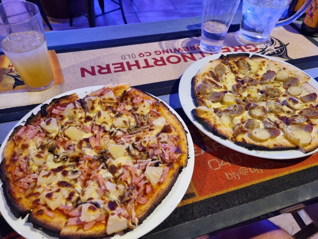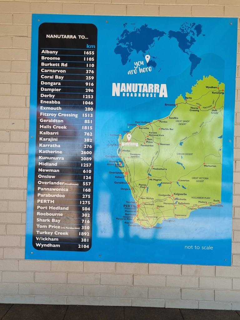 We were both struggling in the heat and headwind and fatigue as we approached the outskirts of Port Hedland. Thankfully our planned lunch stop was not far – the Walkabout Hotel, opposite Port Hedland airport. We arrived in the early afternoon, and I was so spent I couldn’t do anything. Greg ordered my drink (I requested pineapple juice, ice and a ginger beer to make a tropical punch) and we quickly decided our pizza order. There were some quirky country / mining town pub posters, but at least it was cool. After lunch and recovering it was the last leg into town.