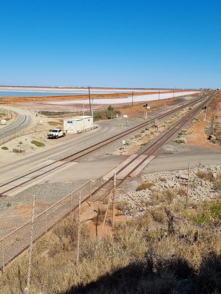 We made our way into Port Hedland proper, copping abuse from one 4WD – this was the only time we got abuse on the whole trip, pretty typical of my impressions of Port Hedland. It is essentially an oversized industrial area and port, with some suburbs tacked onto the edges. We took the highway but had to backtrack to get onto the bike path to cross the bridge towards town, stopping for requisite photos of the railway and salt operations. The bike path then ended and we were back on the main road. This was fine while there was a shoulder, but when the shoulder ended we had to abandon that road as there was too much two-way traffic and trucks. We detoured into the suburbs, then to the supermarket to top up our groceries for the next 3-4 days.