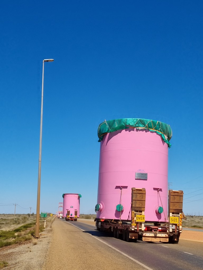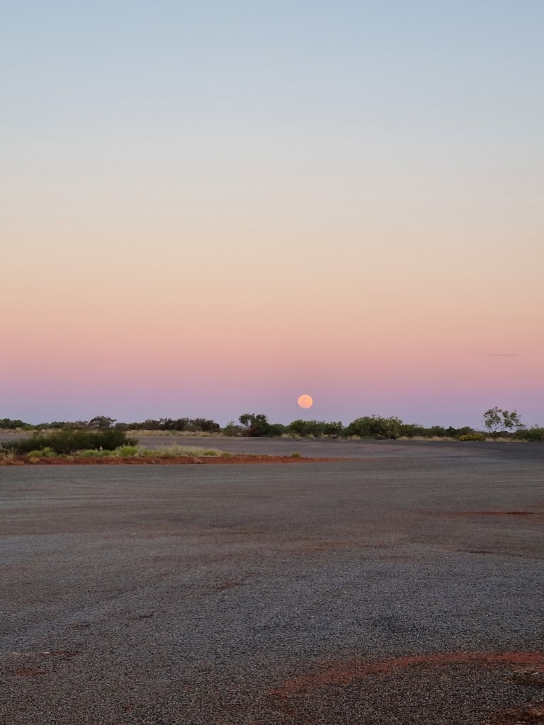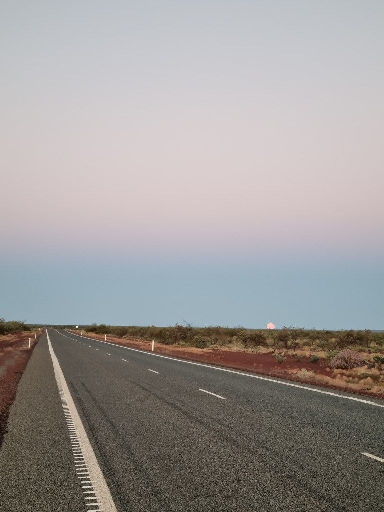 An early start this morning, as we had a long way to go and were expecting our first day of contrary winds. The beautiful full moon set as the sun rose, but the tranquility was disrupted by lights and a low hum of noise coming from numerous mine sites on both sides of the highway.