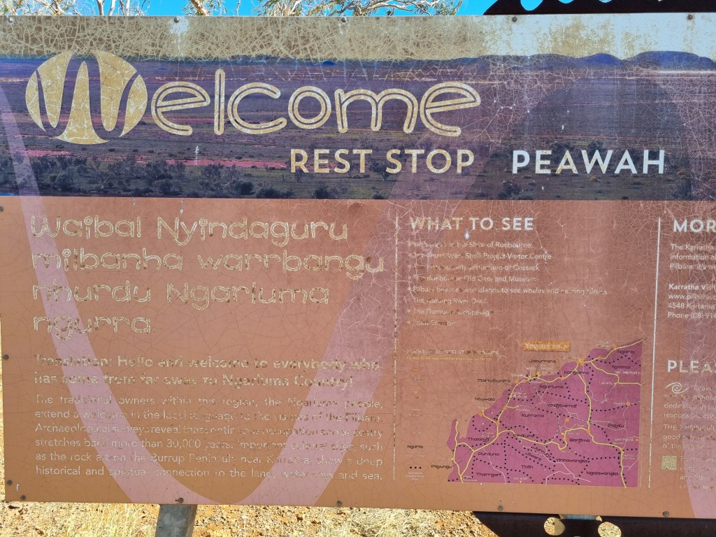 I had kept myself motivated by considering what I would like to eat for lunch at Nanuturra. Thankfully they had gluten free bread and meals-to-order, so I could get the steak sandwich and zesty lemon drink I had been dreaming of. Nanuturra was the last roadhouse coming from the Perth direction before heading out to Karijini National Park – this is where we re-joined the original route. It was very busy with many noisy people and groups. It was a bit much for me, and the culture shock of so many people was making me grumpy. It was noisy inside, so we sat outside – thankfully there were shady tables but a better break from the heat probably would have done us good. After lunch, we took the opportunity to have a last toilet stop and I was so sleepy I put my head in my arms on the table and napped for a few minutes while I waited for Greg.