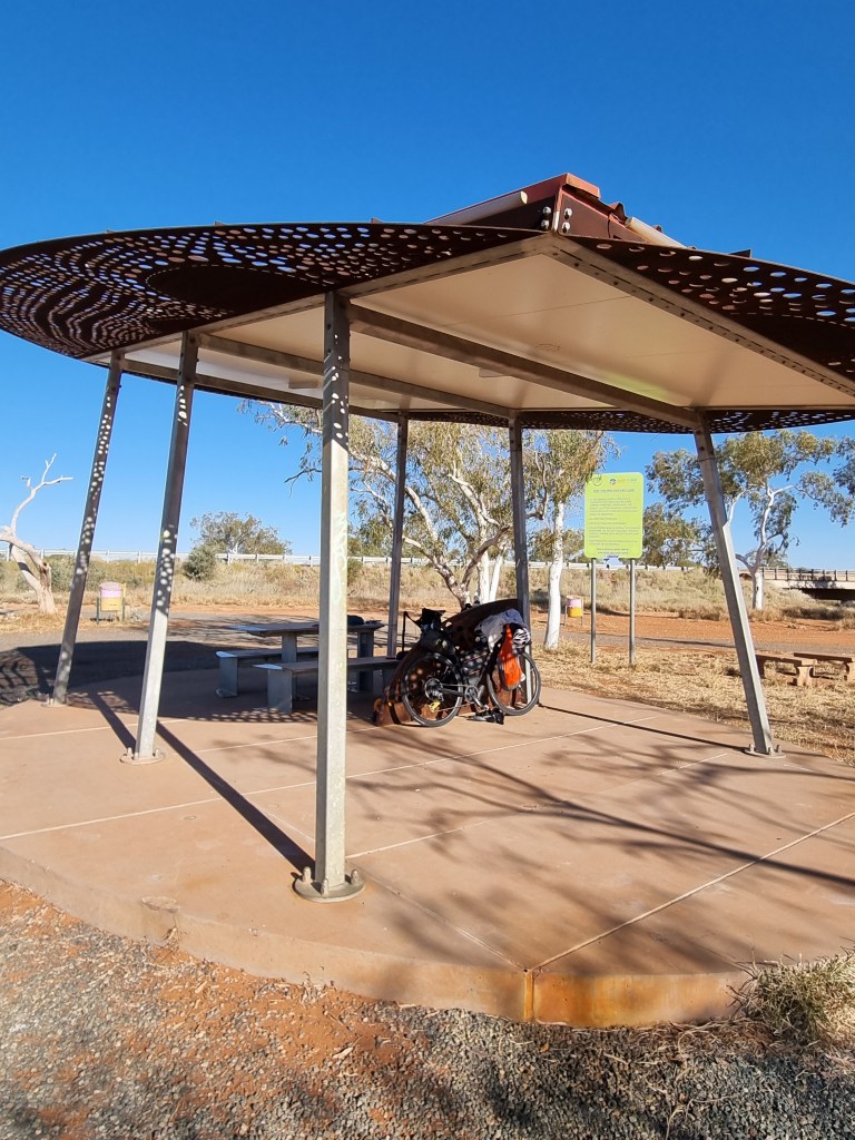 After the interesting sites diminished, it became a pretty boring and hot slog. The disadvantage of leaving late was that we didn’t get much cool riding time. We had intended to finish at Whim Creek today as a bit of a “destination”. There was an old hotel there, although we knew it was permanently closed. About 2pm we stopped at Peawah Rest Area for a break in the shade. There was a shade with a table and concrete underneath, plus toilets. These were good facilities in our books, and we didn’t know what facilities there would be at Whim Creek. Plus it was hot. We decided to call it a day and stay at Peawah Rest Area.