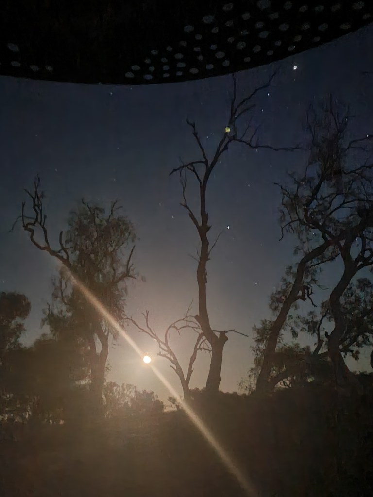 The stars came out and the moon rose – it was a waxing moon, so it was up early in the evening and bright. We had wanted to do some of our riding in the evening, but logistically it was challenging as we also needed somewhere cool to stay in the day. So it was great that it had worked out for evening riding today. I made an effort to snack during the evening, getting stuck into two of the salami and cheese wraps we’d made in Broome (yes, they were still delicious).