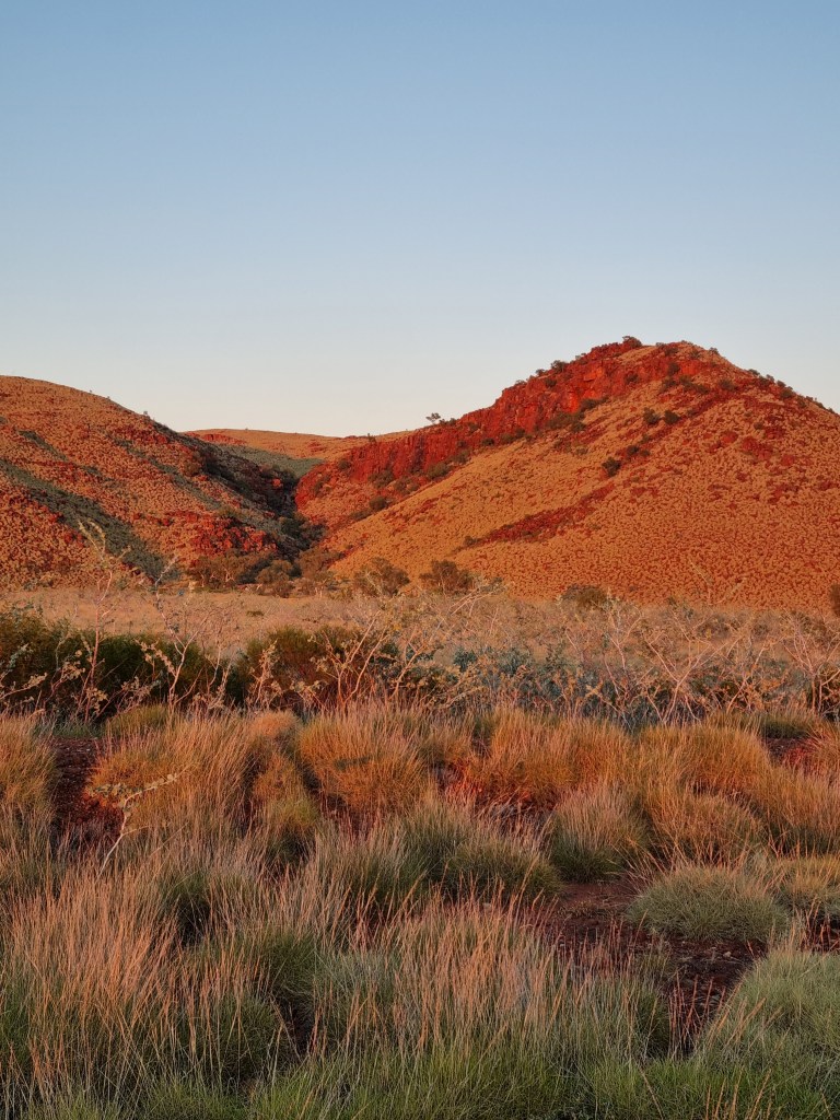 It turned out to be a very special sunrise experience, the pre-dawn light was beautiful in the sky and on the spinifex, we rode past some red Pilbara hills as the sun was rising, and saw beautiful colours glowing on the rocks.