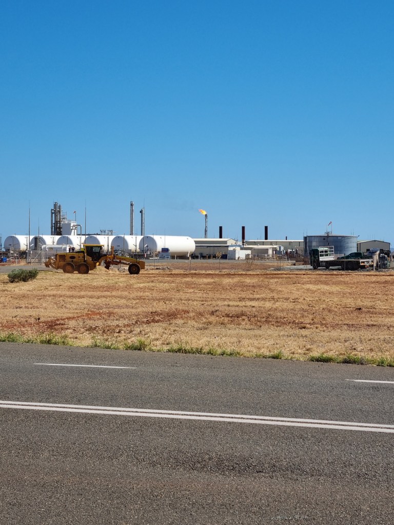 After our delicious breakfast, we trundled the 7km back to the highway and then continued south, or actually west for a good chunk before turning more southerly. We passed a few gas plants on the way out of town – both of us find large infrastructure and industry interesting, so we had to stop for some photos. I also got a photo of the most common sign of the trip “floodway” – we saw many of these signs every day.