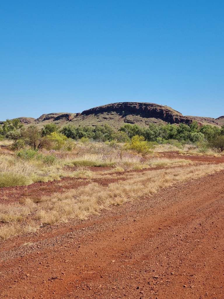 There were carpets of mauve mulla mulla flowers – I had seen several different species on the trip with different life forms, and now they were prolific. We had a few moderate (~3%) climbs, which also gave a vantage to see the spread of wildflowers. Coming in towards Fortescue River Roadhouse, we crossed Fortescue River (which had a reasonable pool of water) and saw the remarkable hills bordering the river.