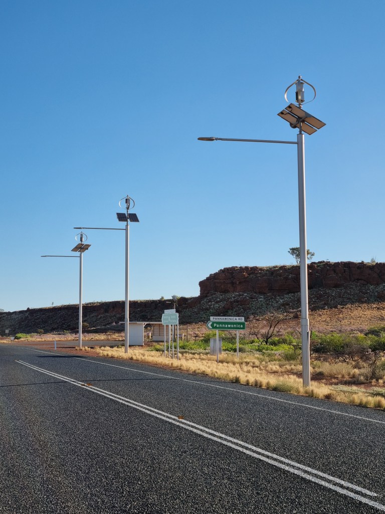 Solar and wind powered lights at the Pannawonica turnoff, which is a key intersection for Rio Tinto iron ore trucks. Robe River rest area was just south of here.